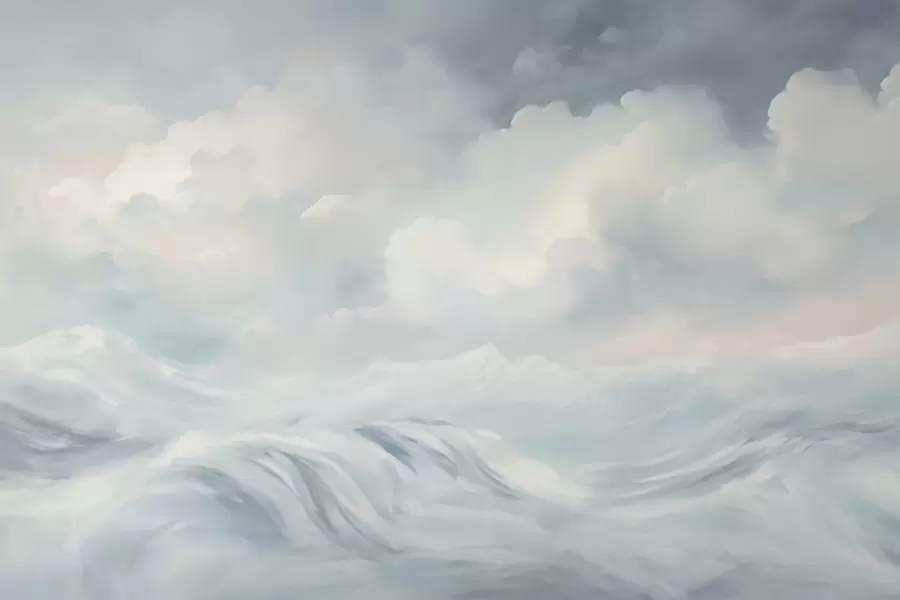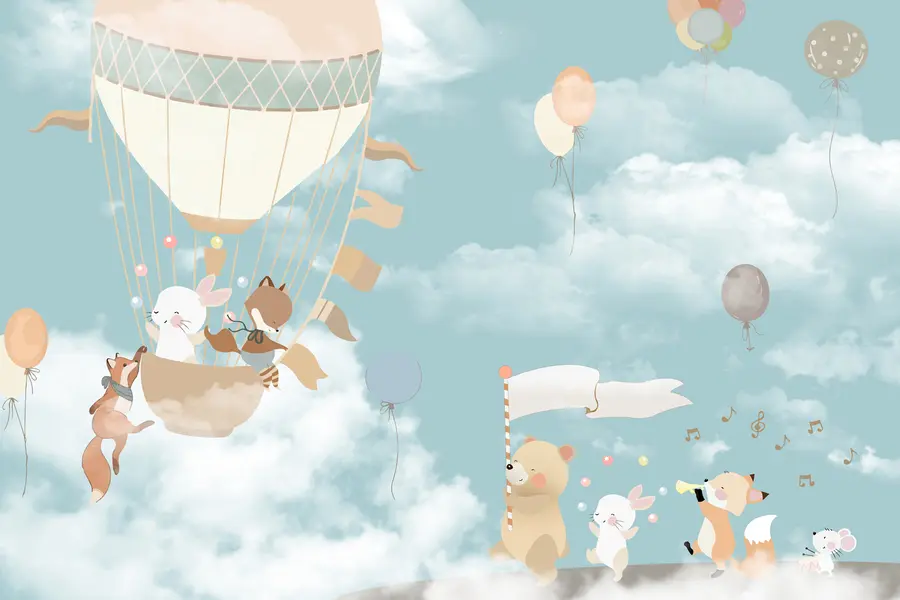 Globos aerostáticos flotando sobre las montañas en tonos pastel neutros y suaves