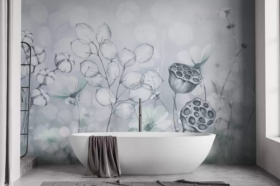 Jardín de flores de ensueño, mariposa, flores de algodón, lotos, colores grises