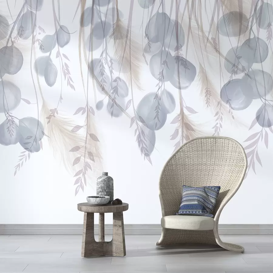 Delicadas hojas de eucalipto azul y beige pastel cayendo, creando una atmósfera serena y tranquilizadora