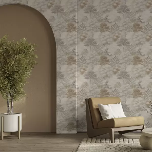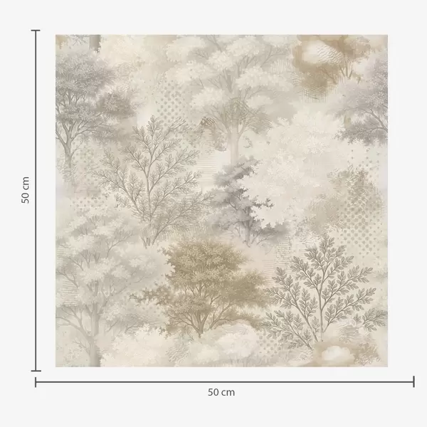 Papel pintado Bosque apacible envuelto en niebla, suaves tonos beige y grisáceos. Nr. a00785