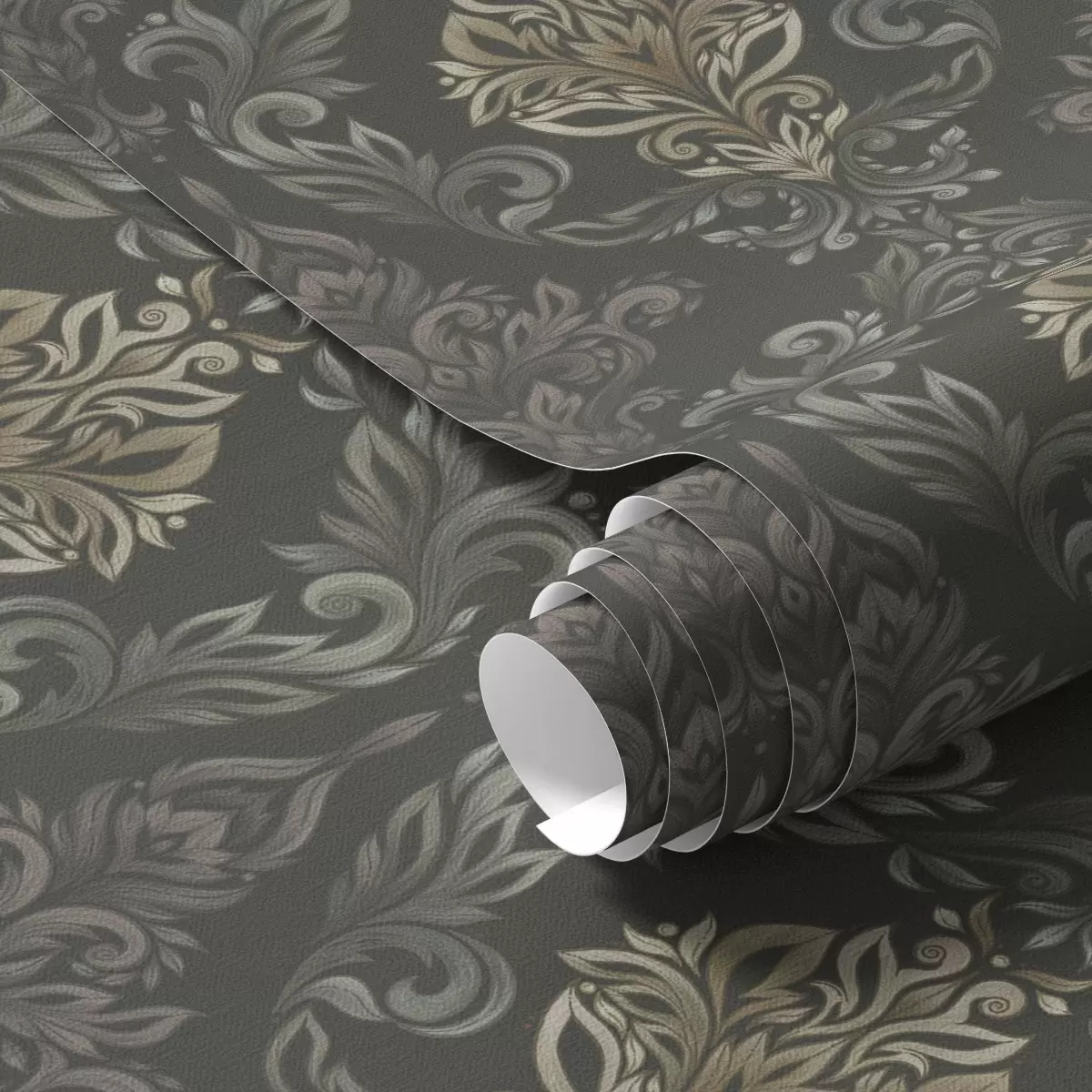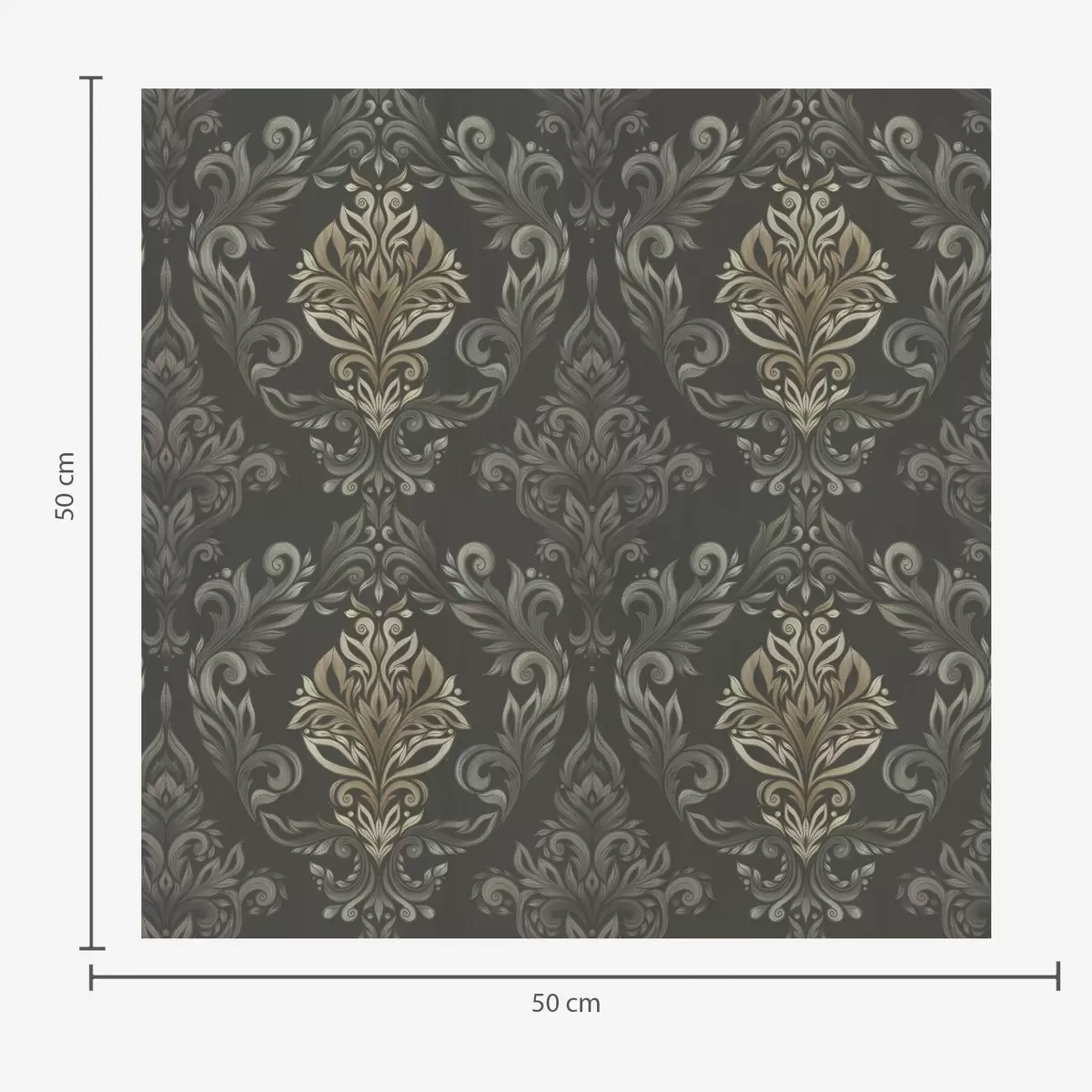 Papel pintado Damasco sobre fondo grafito oscuro, detalles en ocre oliva. Nr. a00828v5