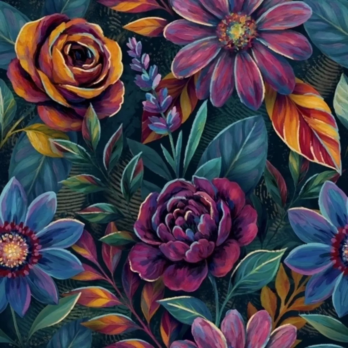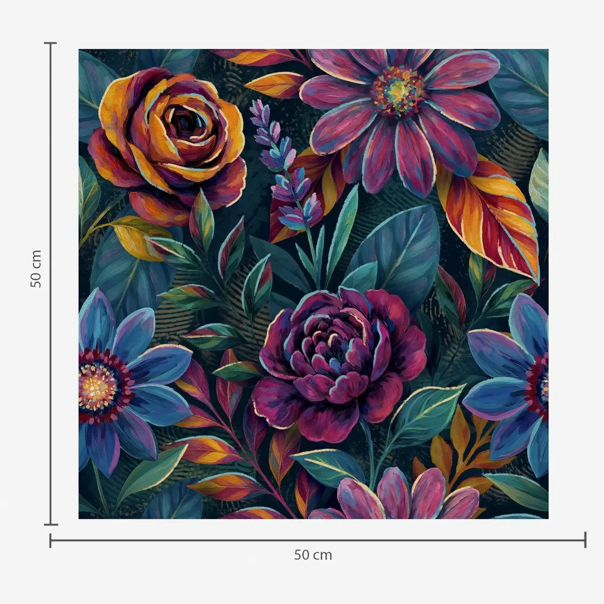 Fotomurales Vibrantes motivos florales en tonos joya sobre fondo azul marino intenso. Nr. a00871