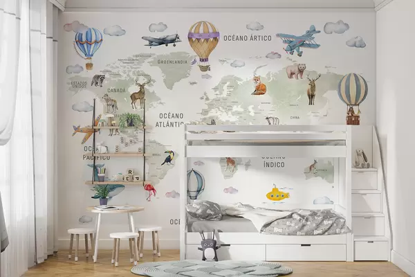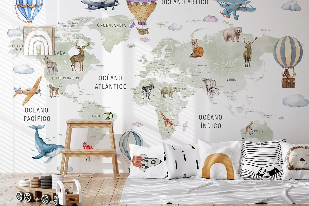 Fotomurales Mapa infantil en estilo acuarela con animales y globos aerostáticos. En español. Color verde. Nr. c00001es