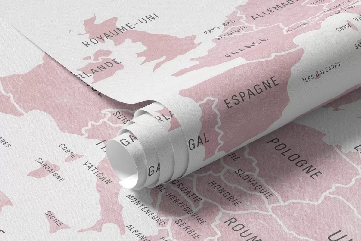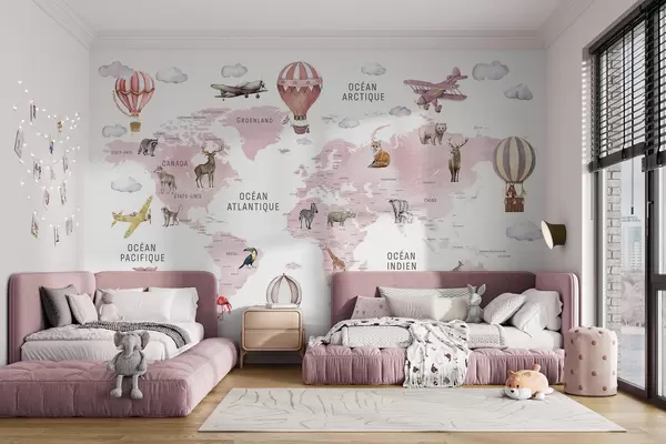 Fotomurales Mapa infantil en estilo acuarela con animales y globos aerostáticos. En francés. Color rosa. Nr. c00001frv3