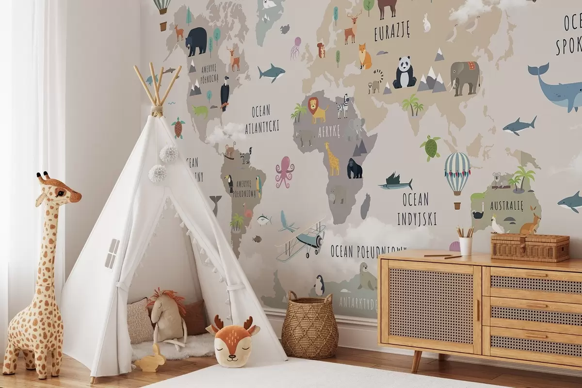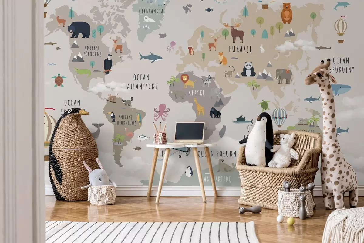 Fotomurales Mapa mundial infantil con animales y globos aerostáticos. Idioma polaco. Nr. c00002pl