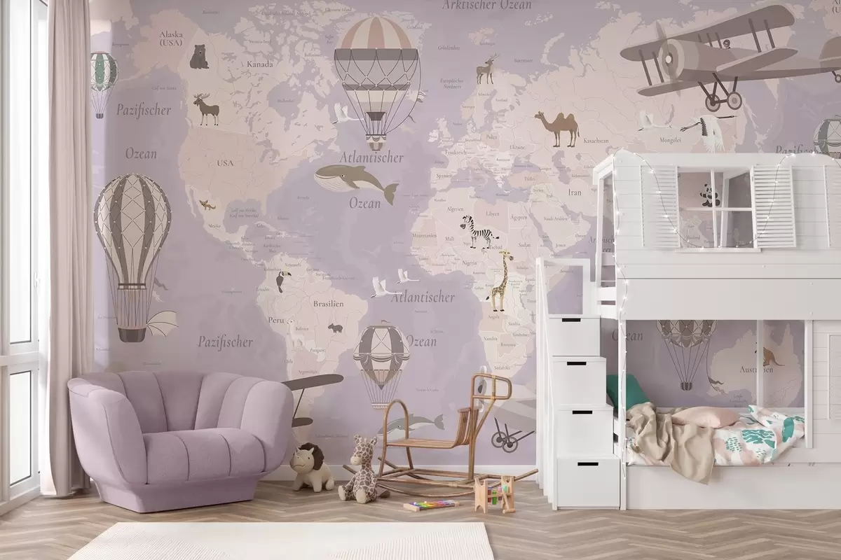 Fotomurales Mapa mundial infantil con animales, aviones y globos aerostáticos. En inglés. Color morado. Nr. c00003env4