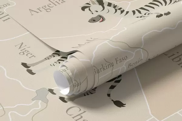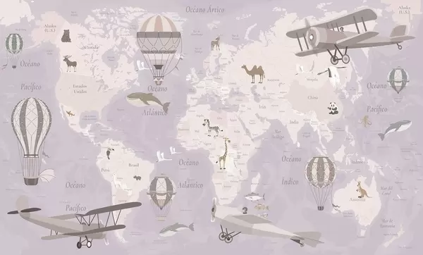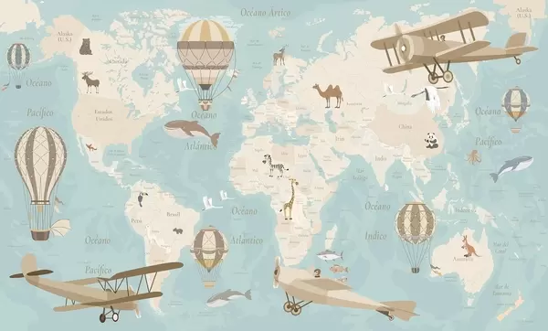 Fotomurales Mapa mundial infantil con animales, aviones y globos aerostáticos. En español. Color beige. Nr. c00003es