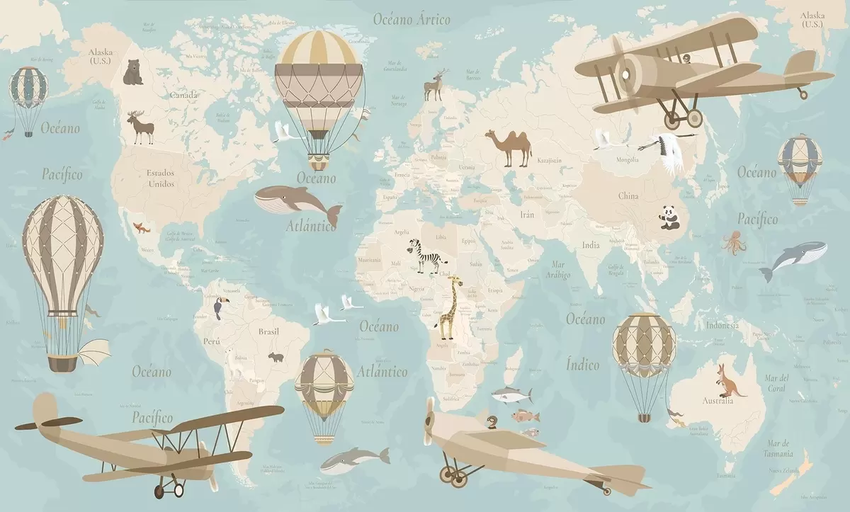 Fotomurales Mapa mundial infantil con animales, aviones y globos aerostáticos. En español. Color azul. Nr. c00003esv1