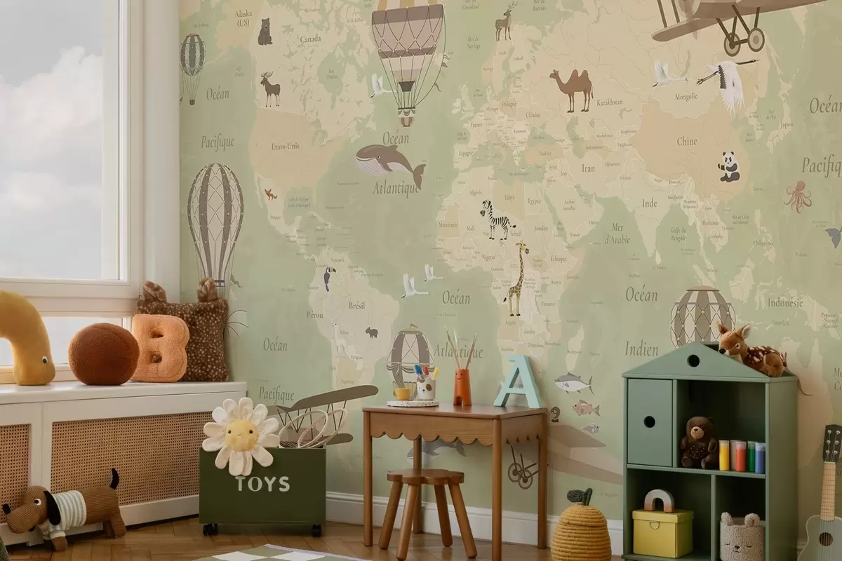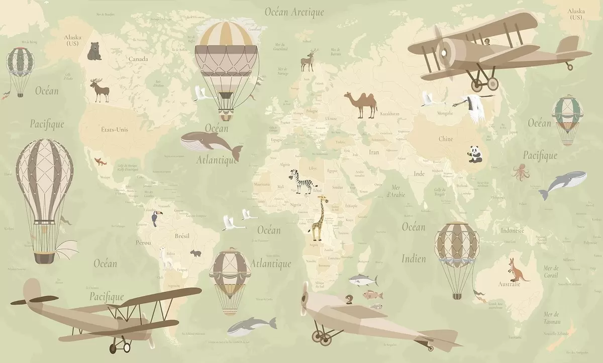 Fotomurales Mapa mundial infantil con animales, aviones y globos aerostáticos. Idioma francés. Color verde. Nr. c00003frv2