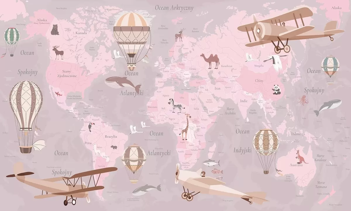Fotomurales Mapa mundial infantil con animales, aviones y globos aerostáticos. Idioma polaco. Color rosa. Nr. c00003plv3