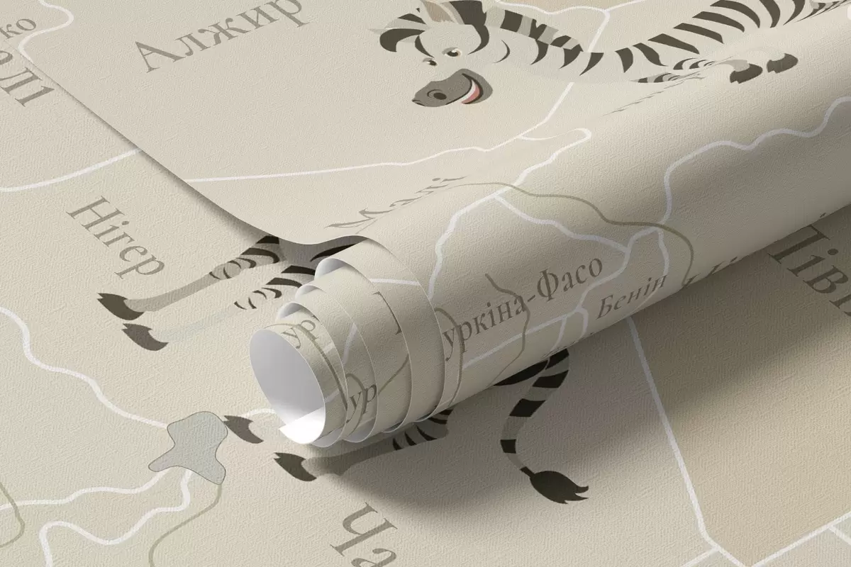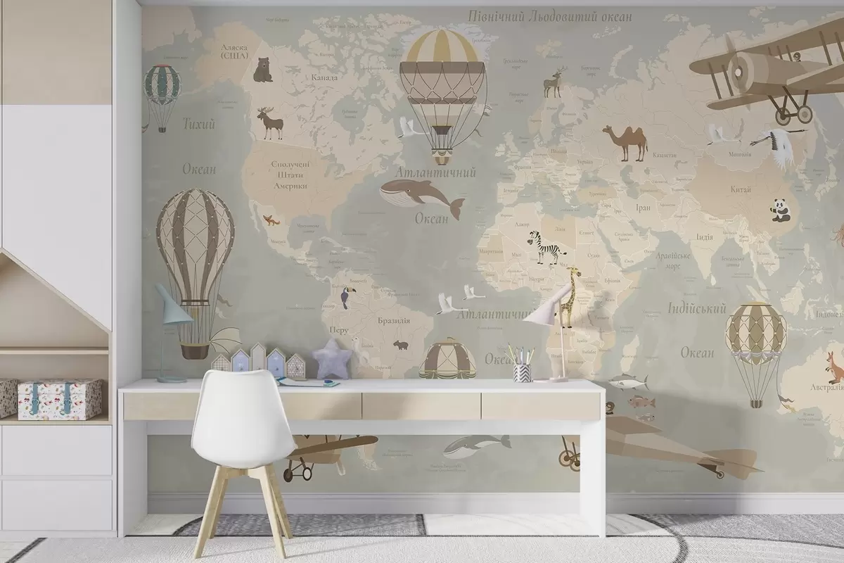 Fotomurales Mapa mundial infantil con animales, aviones y globos aerostáticos. Idioma ucraniano. Color beige. Nr. c00003uk