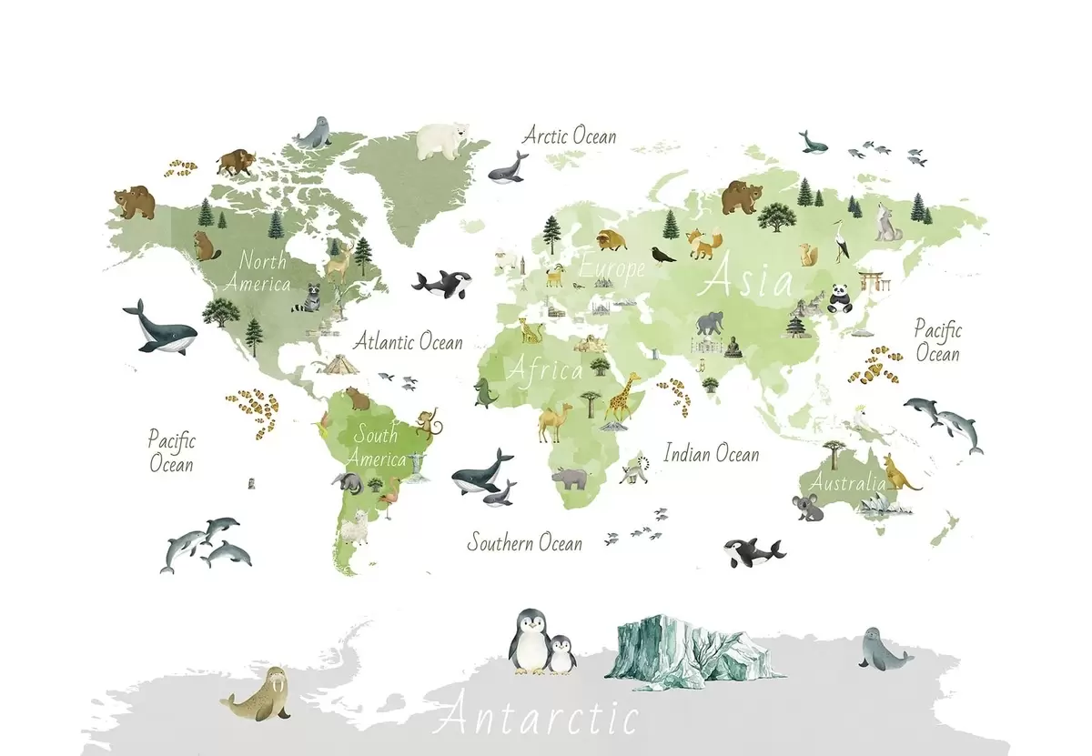 Fotomurales Un mapa de Green en estilo acuarela con animales, plantas y arquitectura. Etiquetas en inglés Nr. c00009env2