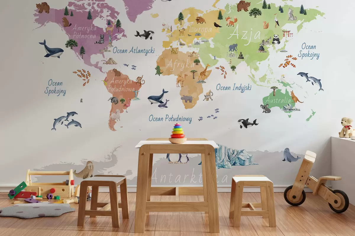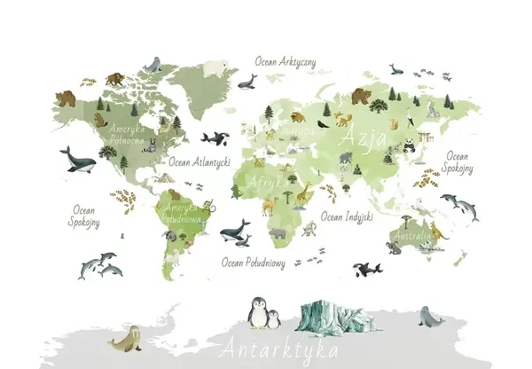 Fotomurales Un mapa a color con estilo de acuarela en el que aparecen animales, plantas y elementos arquitectónicos. Rótulos en polaco Nr. c00009pl