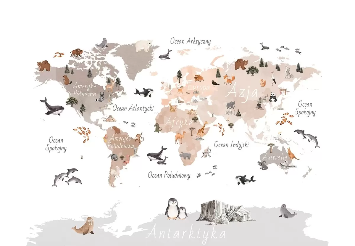 Fotomurales Un mapa en tonos beige, con un estilo de acuarela, en el que aparecen animales, plantas y elementos arquitectónicos. Rótulos en polaco. Nr. c00009plv3