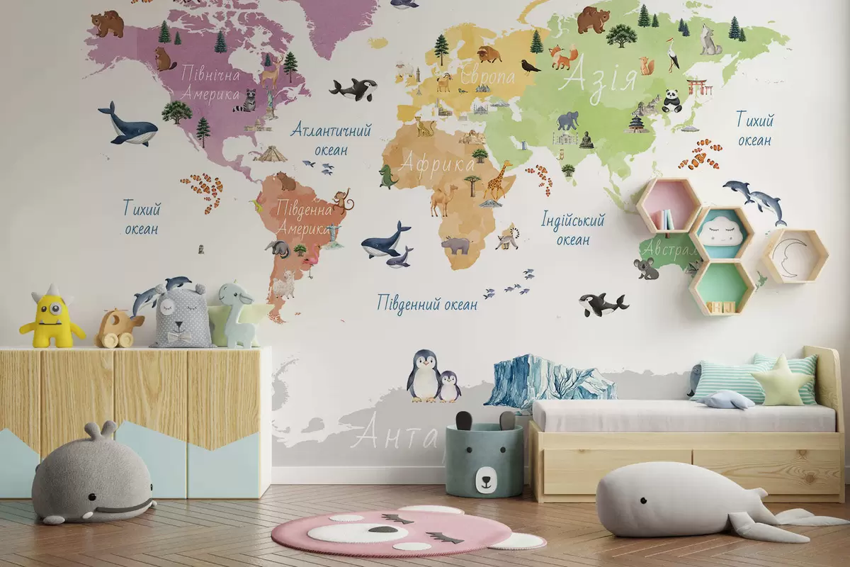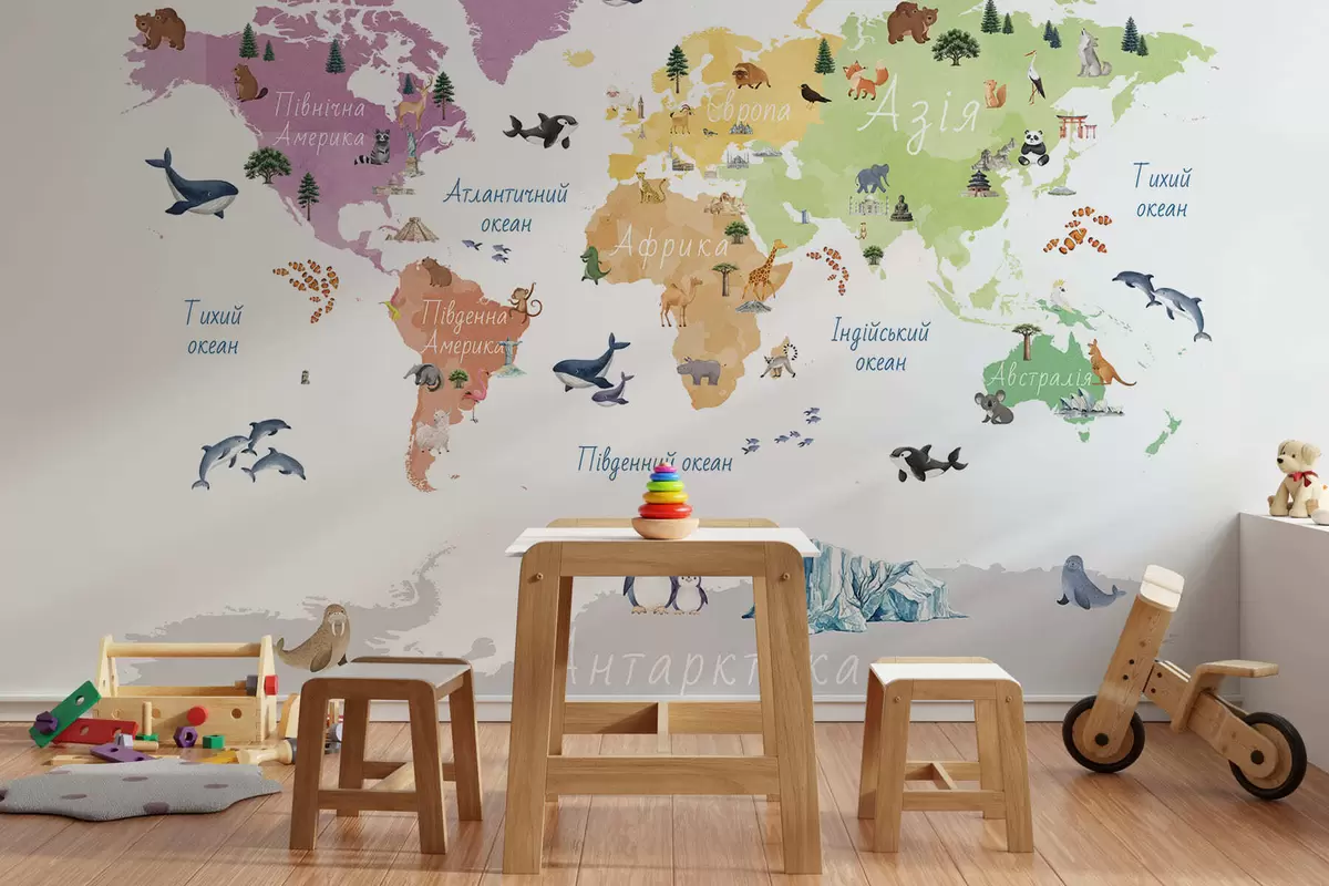 Fotomurales Un mapa a color con estilo de acuarela en el que aparecen animales, plantas y elementos arquitectónicos. Etiquetas en ucraniano Nr. c00009uk