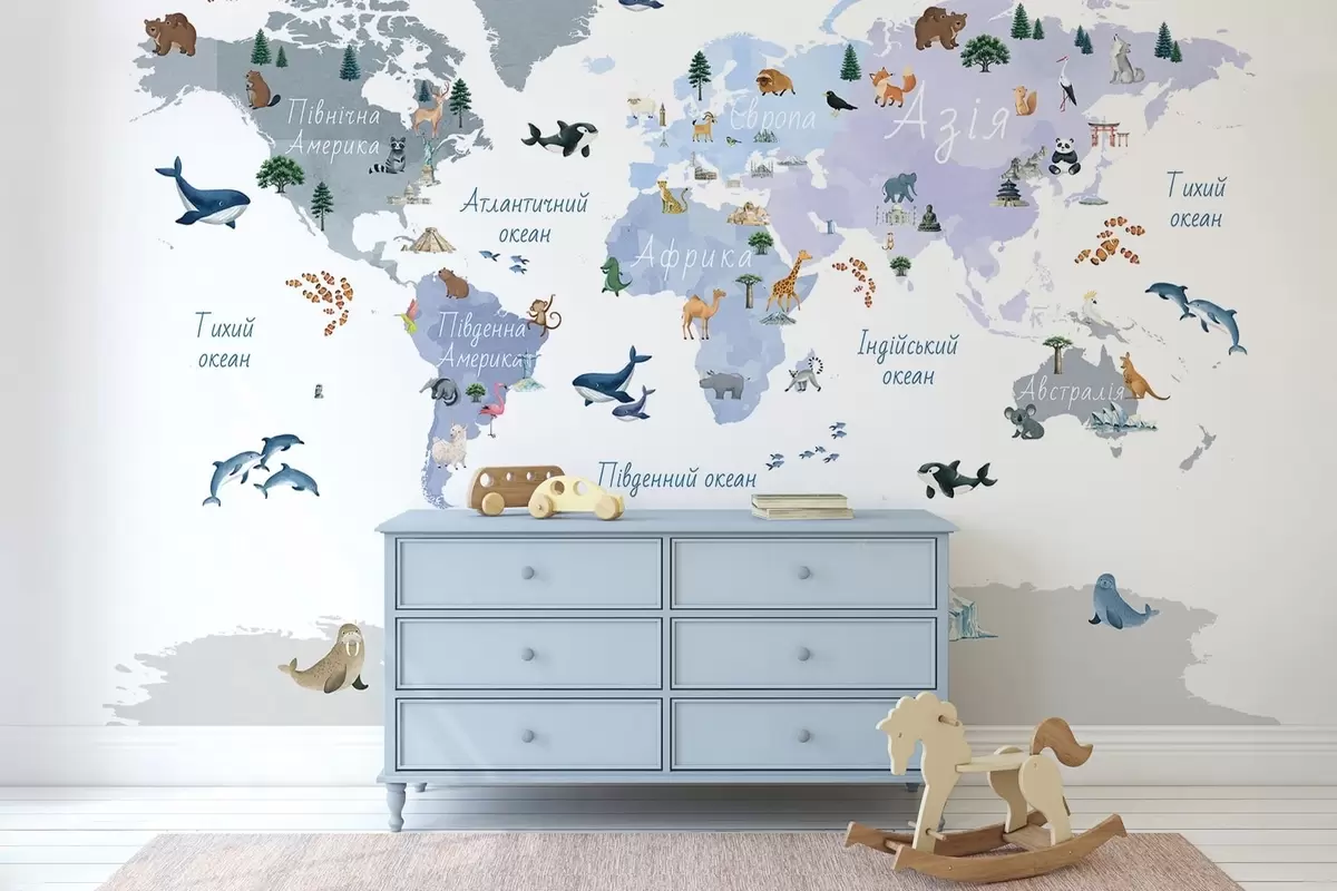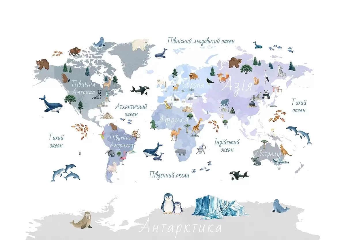 Fotomurales Un mapa azul de estilo acuarela en el que aparecen animales, plantas y elementos arquitectónicos. Rótulos en ucraniano Nr. c00009ukv1