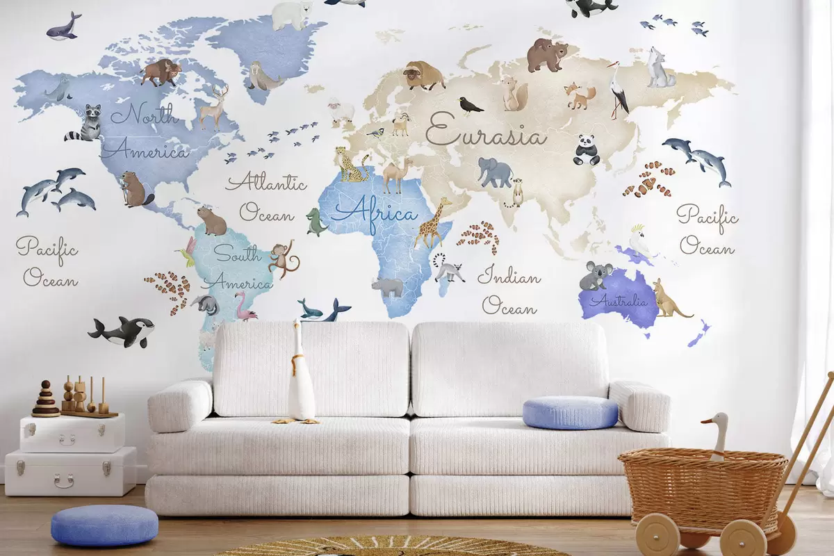 Fotomurales Un mapa azul con estilo de acuarela en el que aparecen animales. Etiquetas en inglés Nr. c00012env1