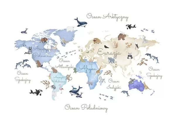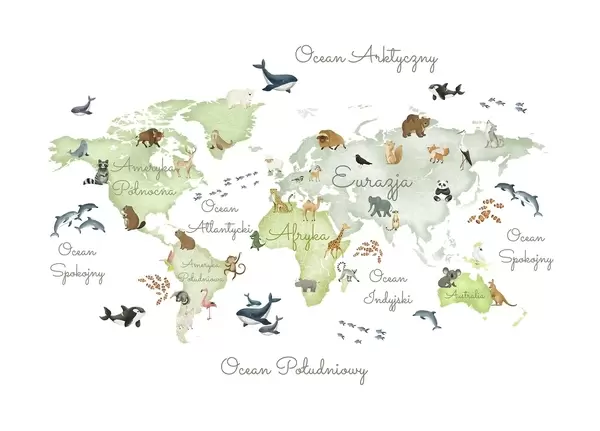 Fotomurales Un mapa a color con estilo de acuarela en el que aparecen animales. Etiquetas en polaco Nr. c00012pl