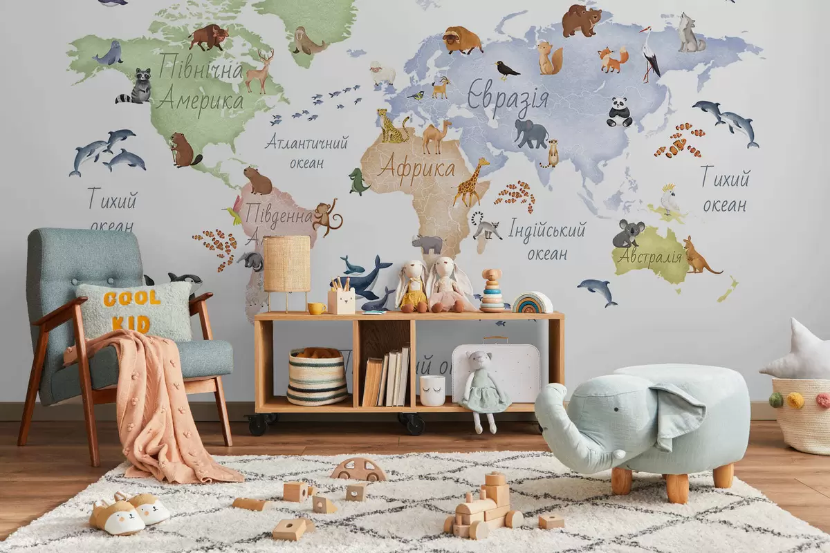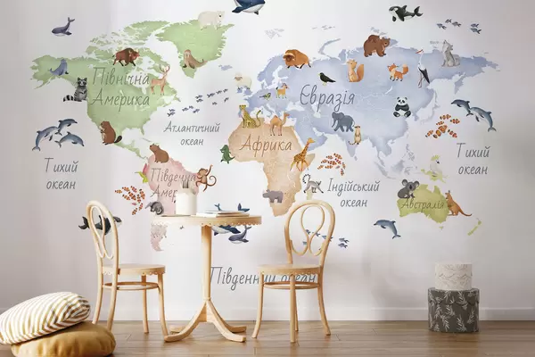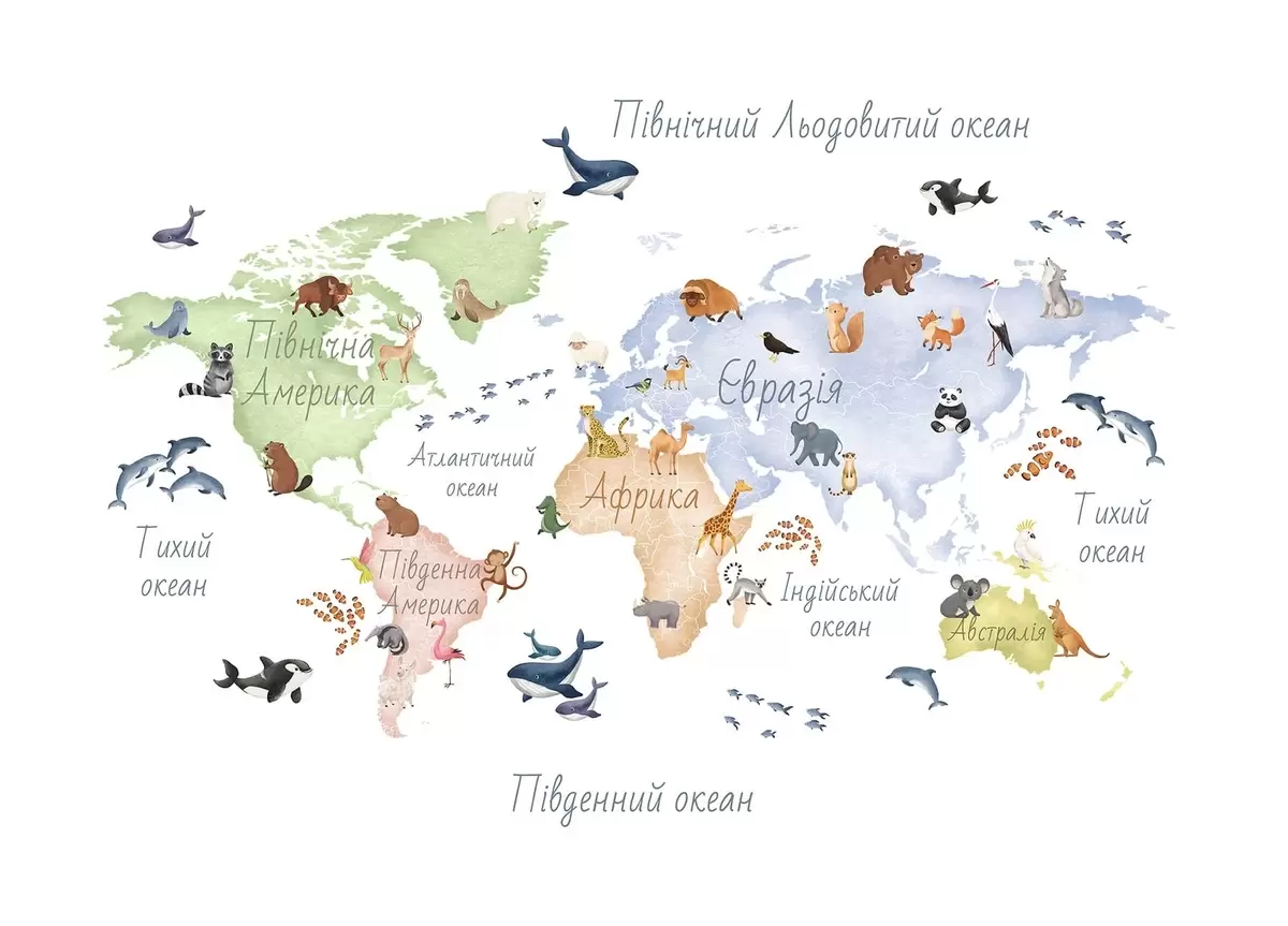 Fotomurales Un mapa a color con estilo de acuarela en el que aparecen animales. Etiquetas en ucraniano Nr. c00012uk