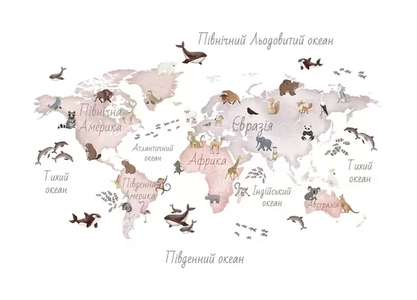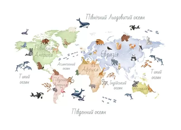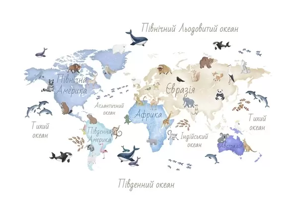 Fotomurales Un mapa azul con estilo de acuarela en el que aparecen animales. Etiquetas en ucraniano Nr. c00012ukv1