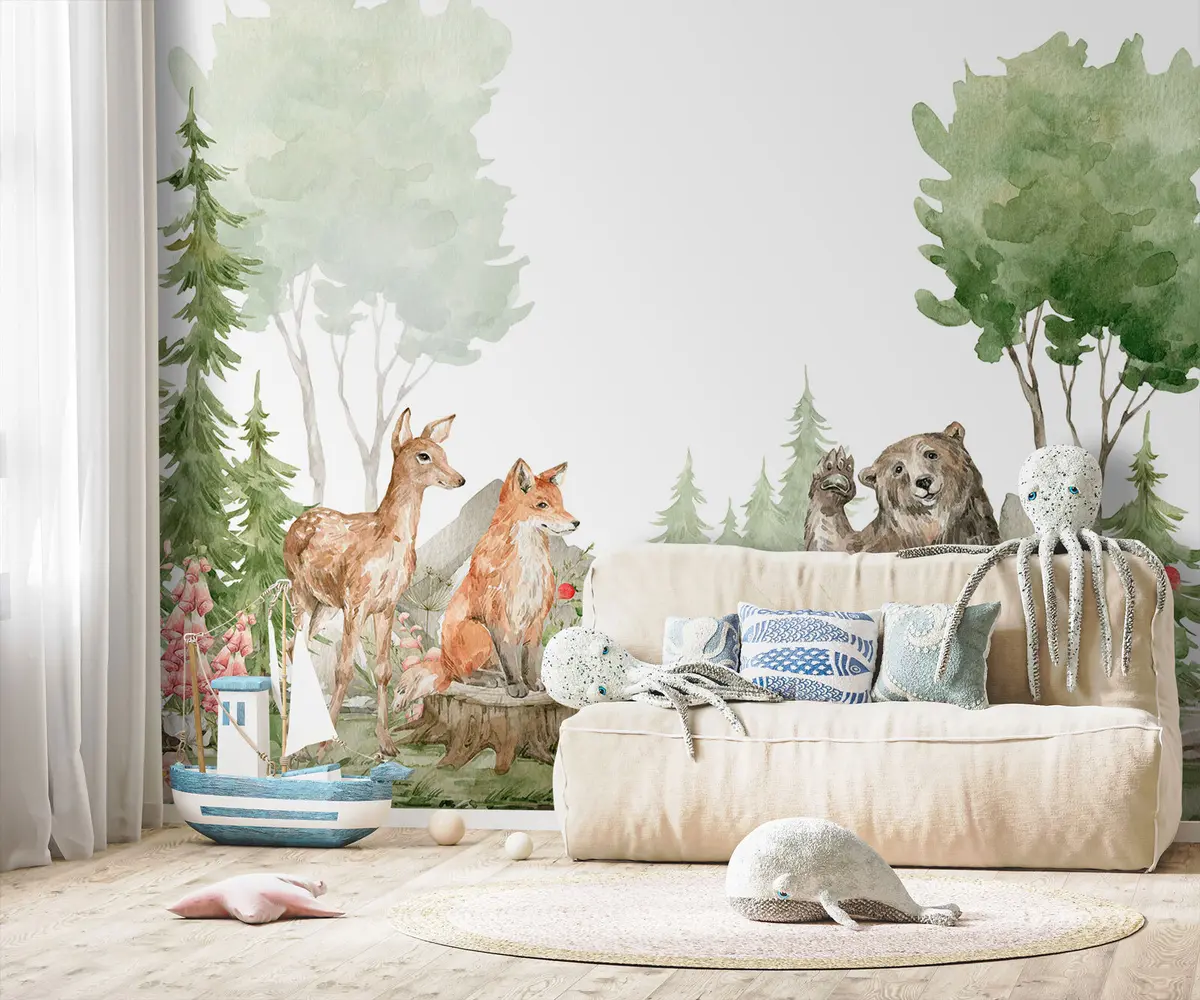 Fotomurales Composición de acuarela con animales de bosque y elementos de la naturaleza Nr. u78735