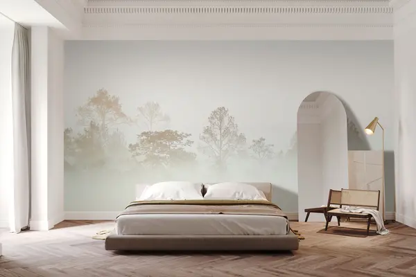 Fotomurales Silueta de una arboleda en la espesa niebla blanca de la mañana Nr. u97405