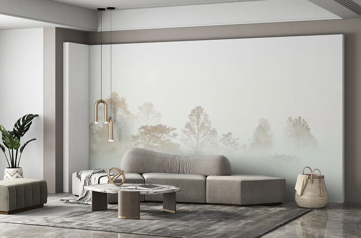Fotomurales Silueta de una arboleda en la espesa niebla blanca de la mañana Nr. u97405