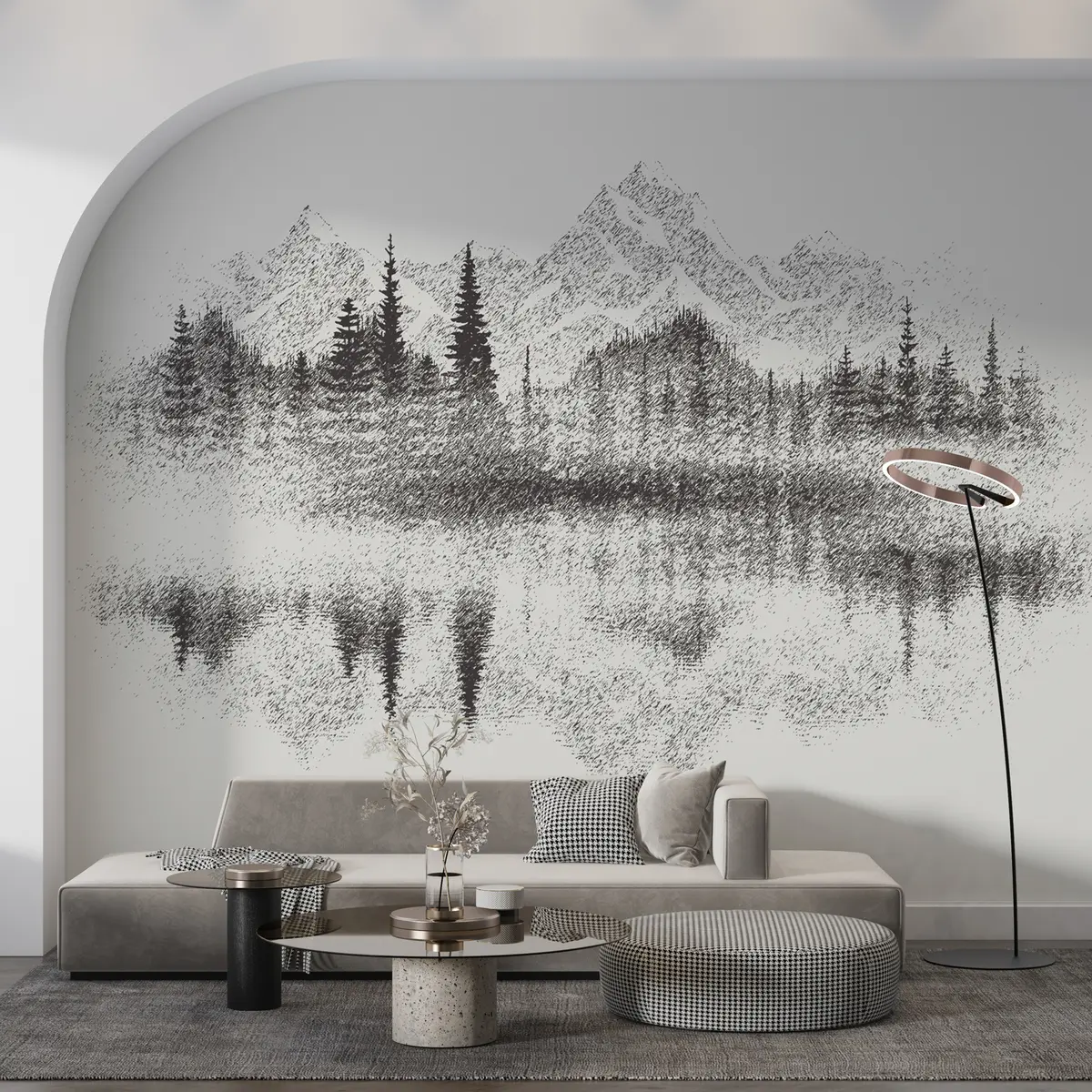 Fotomurales El bosque y las montañas se reflejan en el lago Nr. u98808