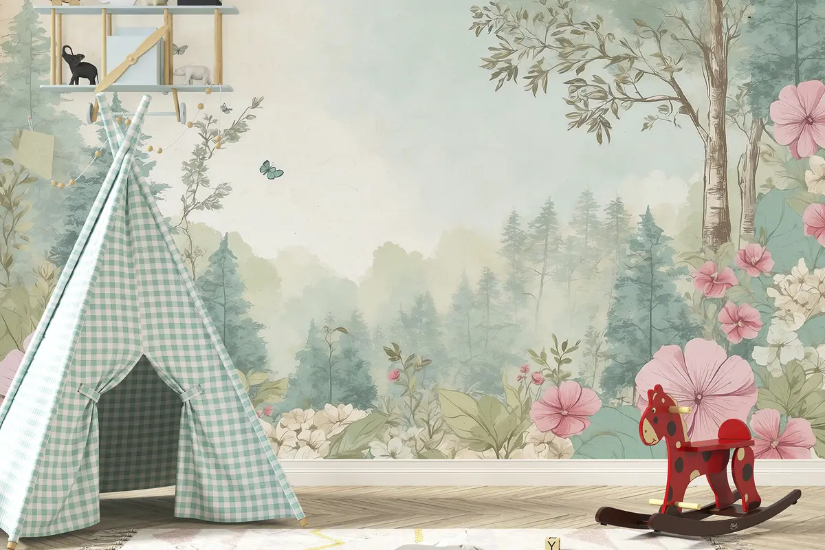 Fotomurales Bosque mágico con flores y pinos, de cuento de hadas, de ensueño Nr. u99567