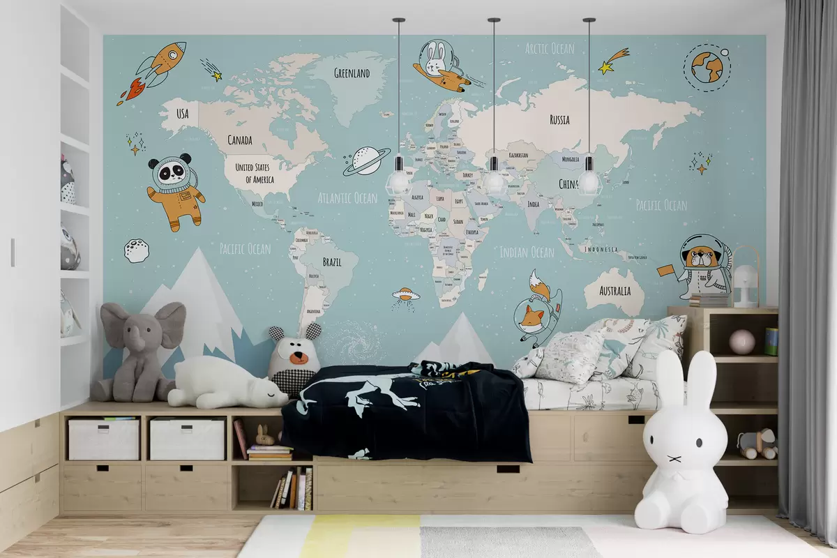 Fotomurales Mapa de países del mundo con animales astronautas. Nr. w00066