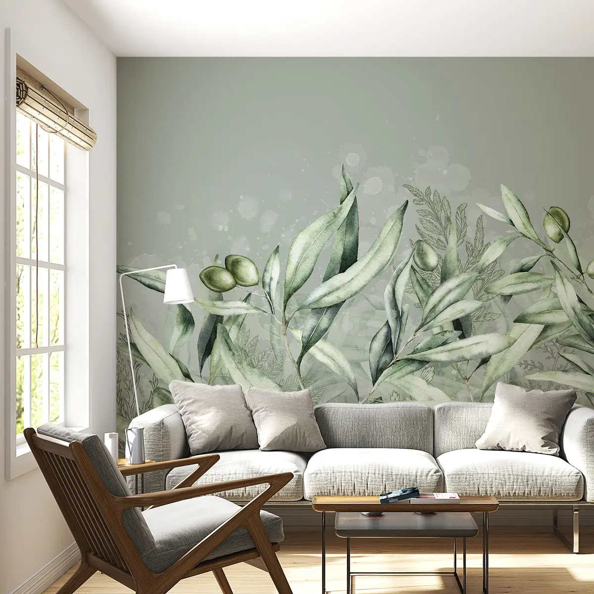 Fotomurales Ilustración de aceitunas, diseño floral, tropical, acuarela, hojas grandes, colores verdes. Nr. w00407