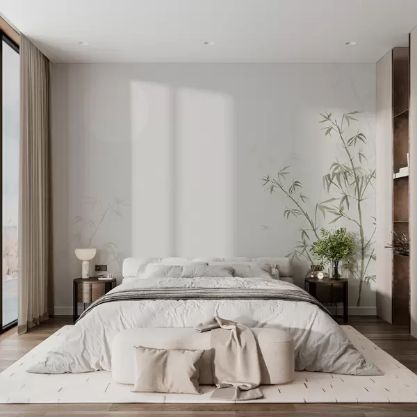 Fotomurales Minimalismo estilo Japandi planta de bambú y sol Chinoiserie color verde Nr. w00547