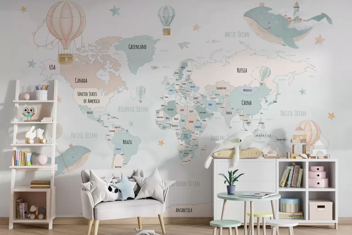 Fotomurales Mapa del mundo con ballenas y globos. Nr. w00680