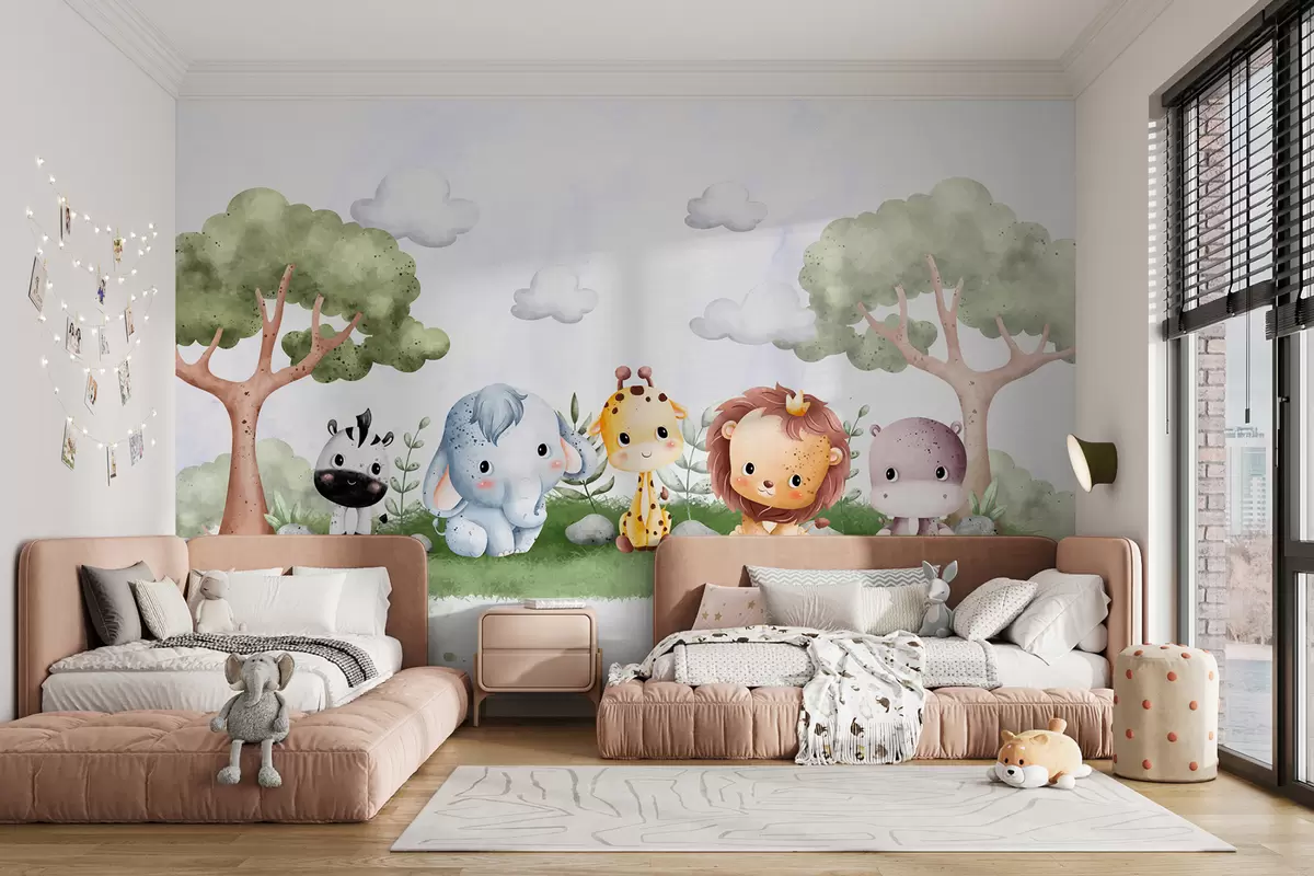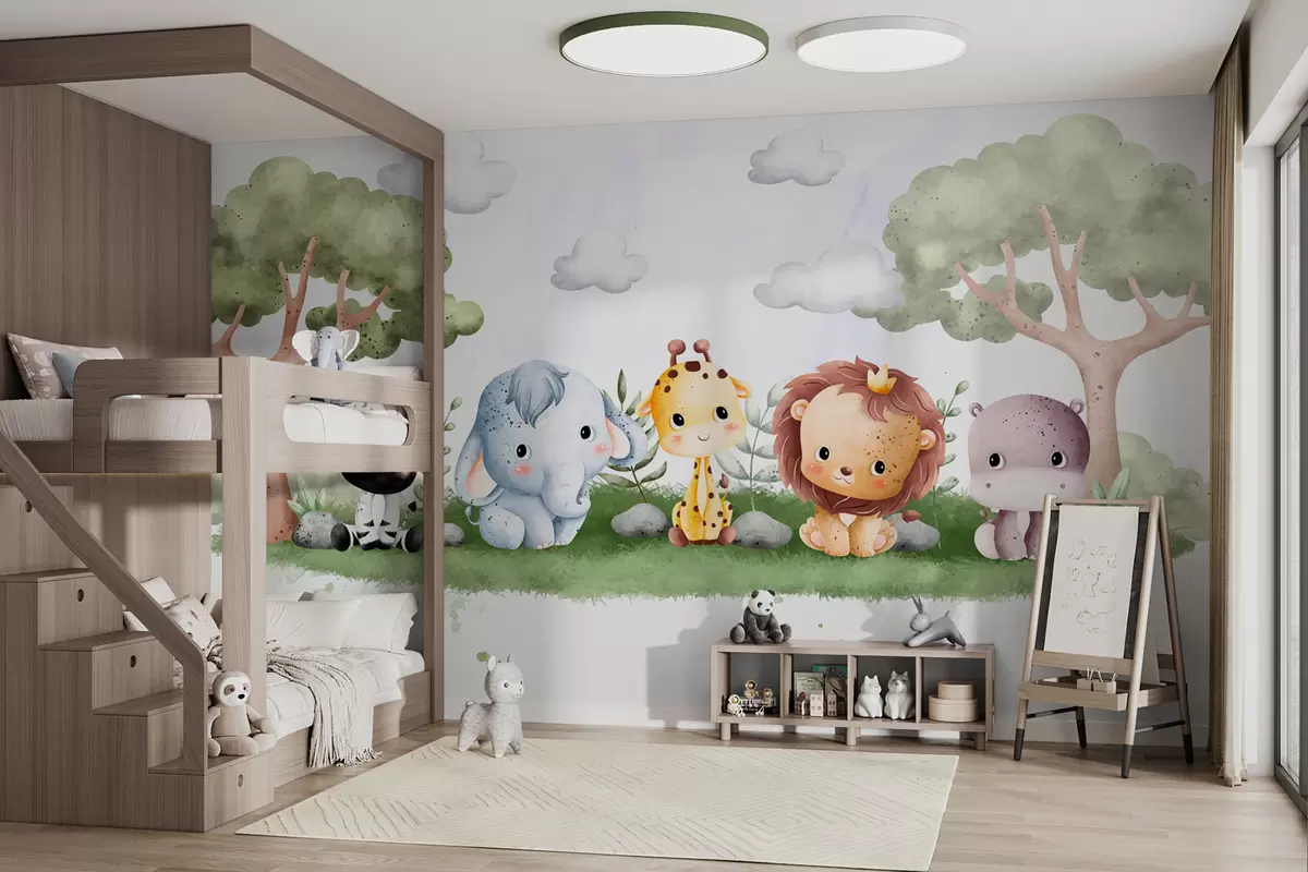 Fotomurales Un grupo de lindos animales de dibujos animados sentados en un campo de hierba con árboles y nubes en el fondo Nr. w00705