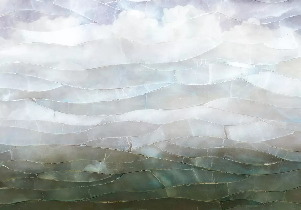 Fotomurales Paisaje texturizado de gradiente abstracto, montañoso y brumoso con campos verdes ondulados a través de la niebla Nr. w00795