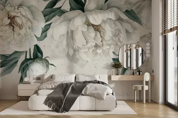 Fotomurales Peonías grandes blancas con hojas verdes sobre un fondo de textura clara Nr. w00837
