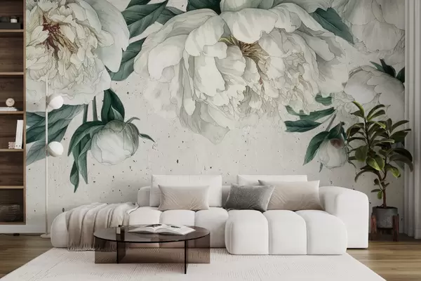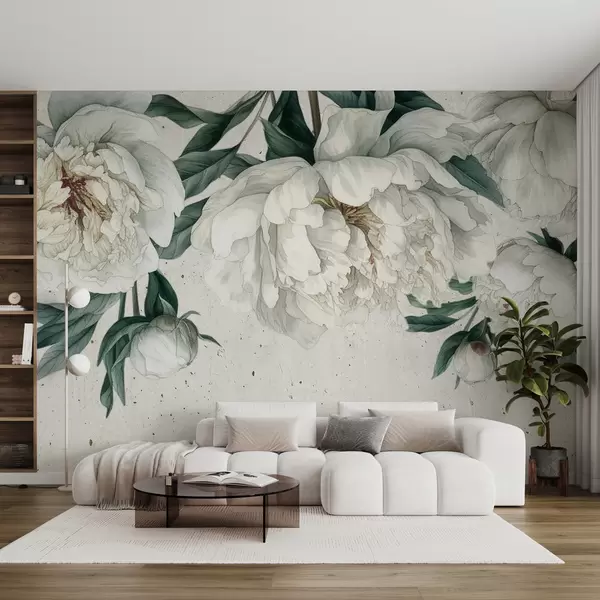 Fotomurales Peonías grandes blancas con hojas verdes sobre un fondo de textura clara Nr. w00837