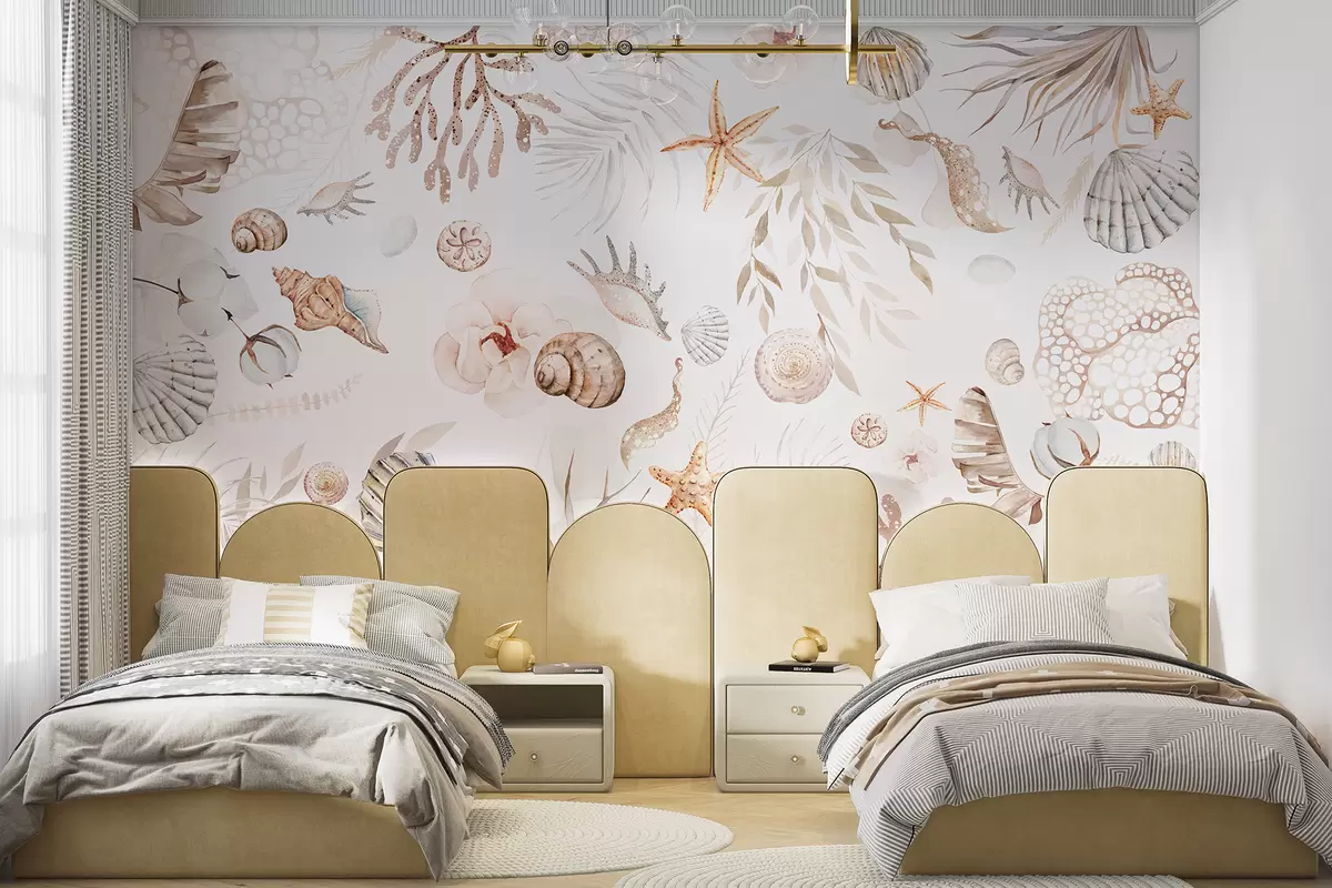 Fotomurales Patrón marino acuarela, estilo boho, conchas marinas, corales, algodón, colores beige Nr. w00851