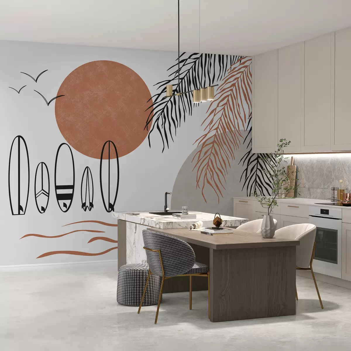 Fotomurales Tablas de surf, dibujo lineal de ramas de palmera, color negro y rojo Nr. w00958