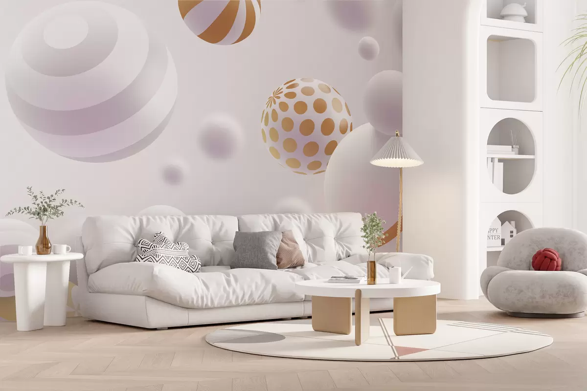 Fotomurales Esferas volantes volumétricas de estilo 3D en tonos grises claros con toques naranjas Nr. w01148