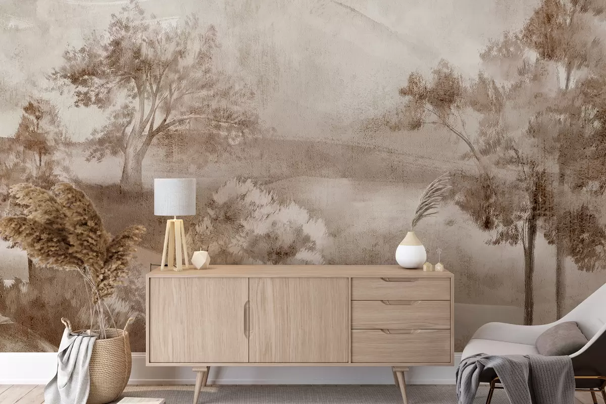 Fotomurales Pintura de paisaje de una escena rural brumosa rodeada de frondosos árboles y follaje en tonos marrones Nr. w01247