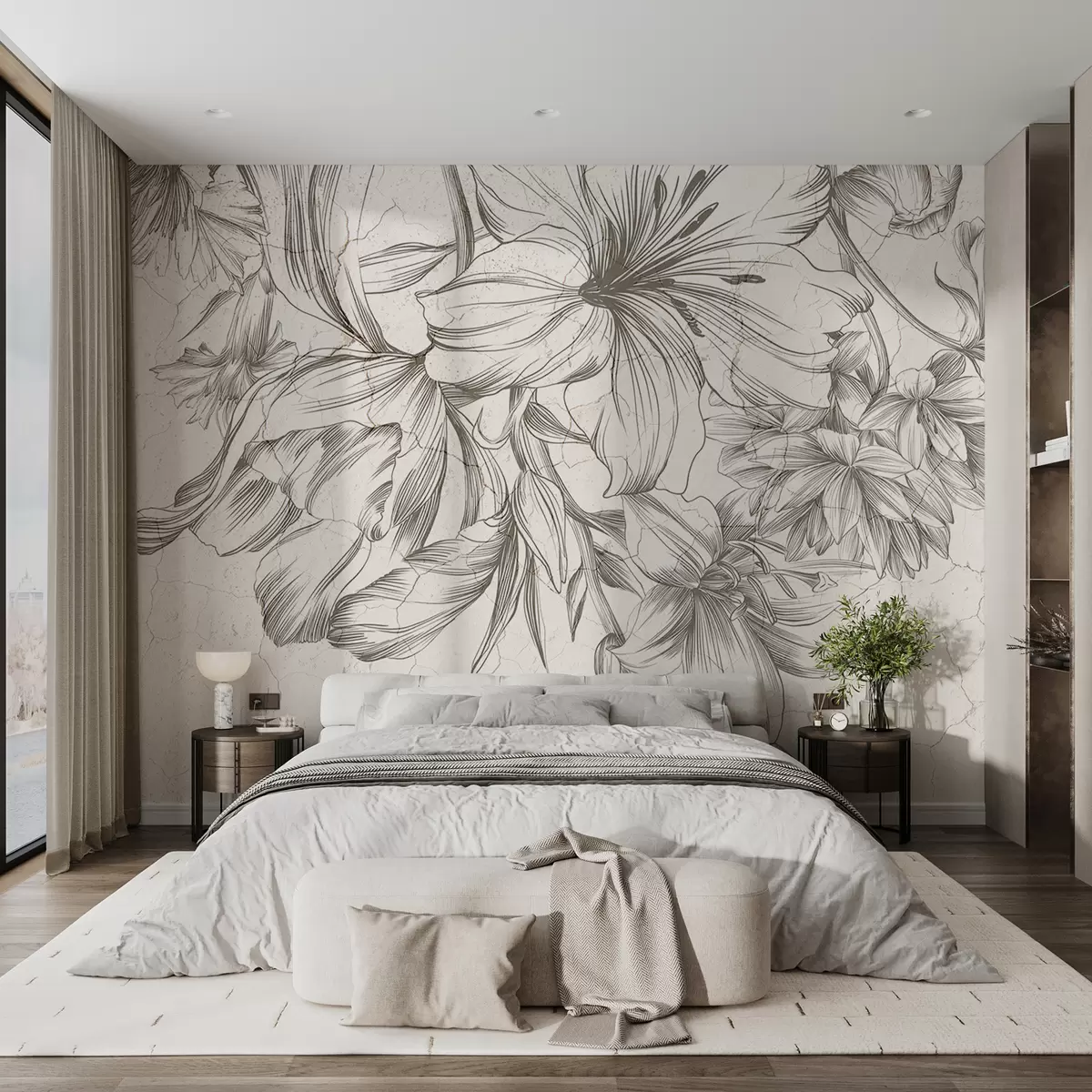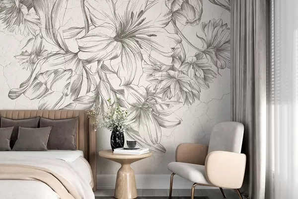 Fotomurales Un boceto en blanco y negro de una impresión gráfica de flores grandes. Nr. w01253