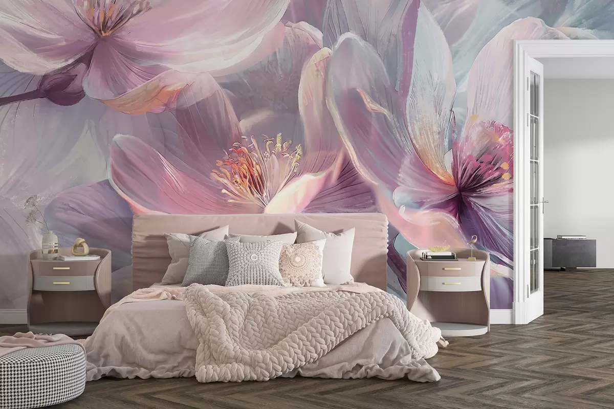 Fotomurales Delicadas flores transparentes de neón pastel, rosa claro y blanco, con fondo suave y borroso Nr. w01307