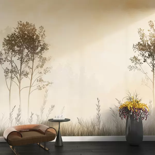Fotomurales Bosque brumoso, paisajes naturales, pradera, árboles, color beige Nr. w01547