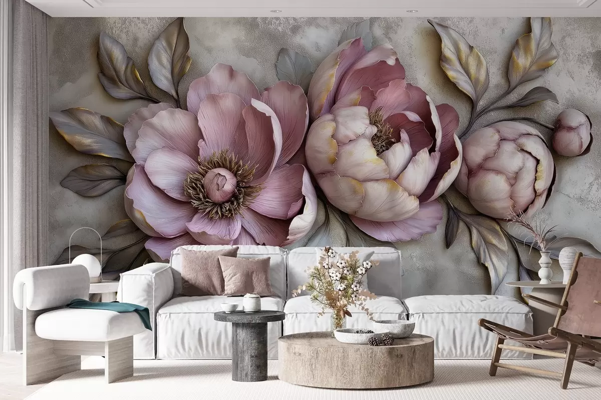 Fotomurales Peonías florales moradas con hojas y pétalos en colores pastel apagados, estilo vintage Nr. w01825