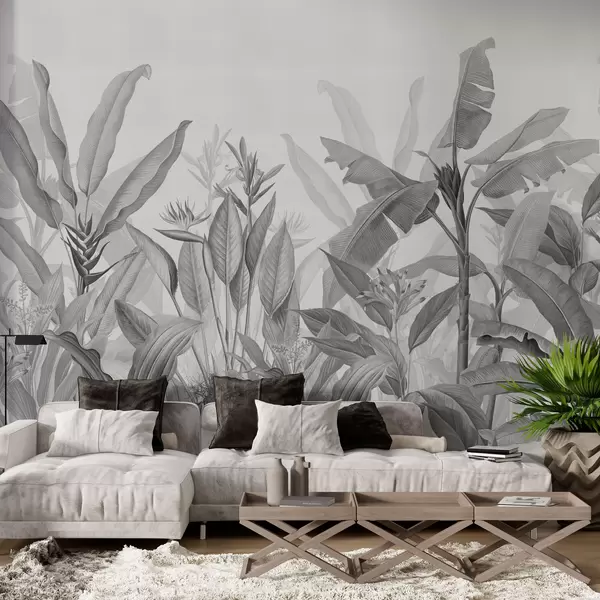 Fotomurales Hojas y flores tropicales en blanco y negro sobre fondo claro Nr. w01834v3