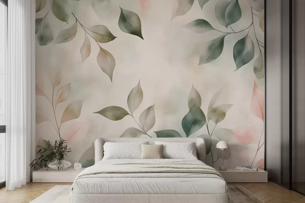 Fotomurales Acuarela verde salvia y follaje rosa Nr. w02069