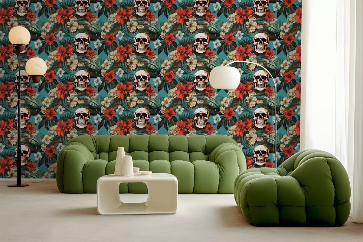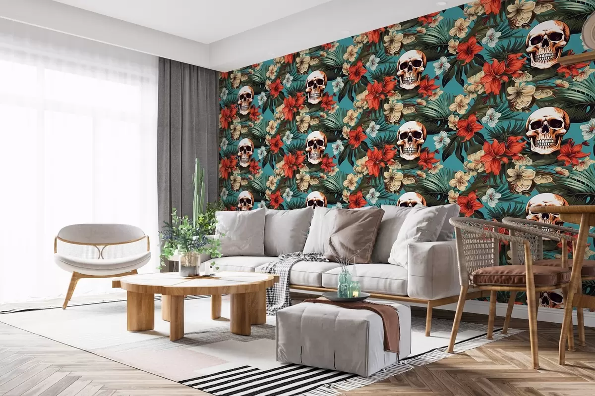 Fotomurales Patrón en esterillas tropicales con flores y calaveras Nr. w02122