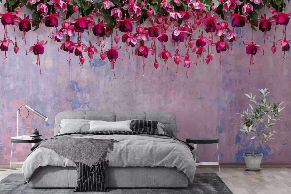 Fotomurales Grandes flores fucsias colgando desde arriba sobre el fondo de una pared retro con imitación de rozaduras Nr. w02132