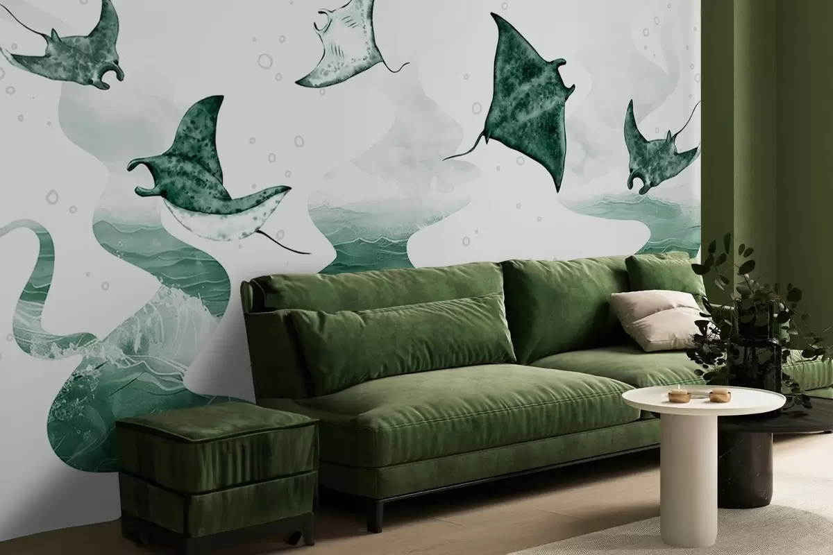 Fotomurales Pez manta raya, estilo acuarela, mar, océano, colores verdes Nr. w02266v2